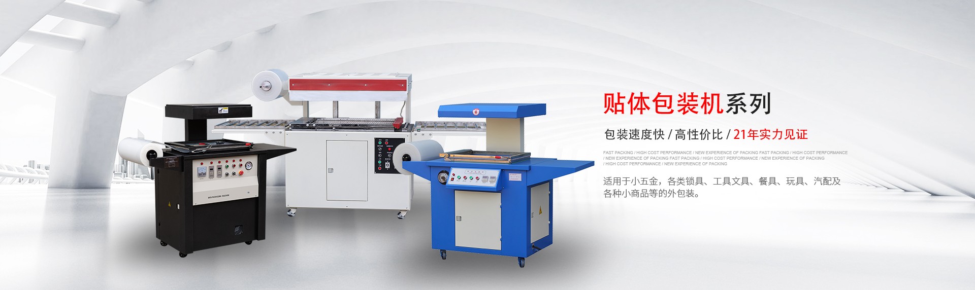現(xiàn)主要產(chǎn)品有:全自動 L 型、邊封薄膜封切機、節(jié)能噴氣式內(nèi)循環(huán)熱收縮機、貼體包裝機、吸塑包裝機、高周波塑膠熔接機、袖口式套膜機、枕式包裝機等多個系列的包裝機械